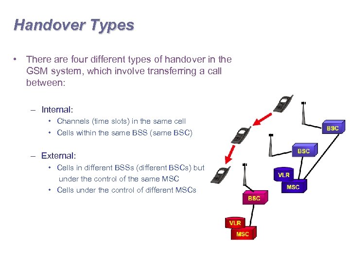 Handover Types • There are four different types of handover in the GSM system, which involve transferring a call between: – Internal: • Channels (time slots) in the same cell • Cells within the same BSS (same BSC) – External: • Cells in different BSSs (different BSCs) but under the control of the same MSC • Cells under the control of different MSCs