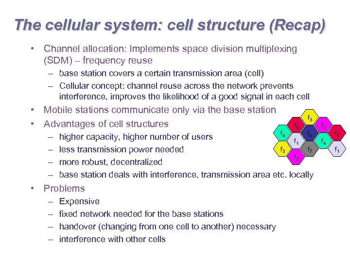 The cellular system: cell structure (Recap) • Channel allocation: Implements space division multiplexing (SDM) – frequency reuse – base station covers a certain transmission area (cell) – Cellular concept: channel reuse across the network prevents interference, improves the likelihood of a good signal in each cell • Mobile stations communicate only via the base station • Advantages of cell structures – – f 4 6 higher capacity, higher number of users f 1 f 3 f 7 less transmission power needed f 2 more robust, decentralized base station deals with interference, transmission area etc. locally • Problems – – f f 5 f 3 Expensive fixed network needed for the base stations handover (changing from one cell to another) necessary interference with other cells f 2 f 4 f 5 f 1
