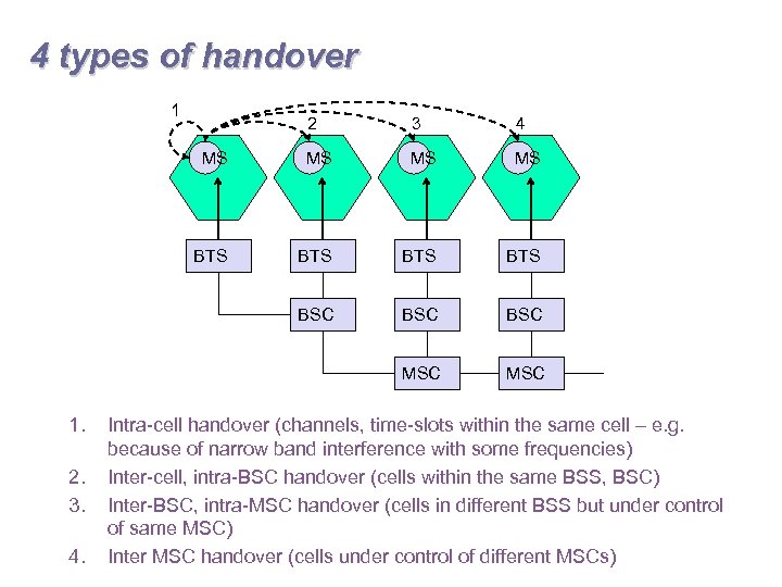 4 types of handover 1 MS MS MS BTS BTS BSC BSC MSC 4. 4 BTS 2. 3. 3 MS 1. 2 MSC Intra-cell handover (channels, time-slots within the same cell – e. g. because of narrow band interference with some frequencies) Inter-cell, intra-BSC handover (cells within the same BSS, BSC) Inter-BSC, intra-MSC handover (cells in different BSS but under control of same MSC) Inter MSC handover (cells under control of different MSCs)