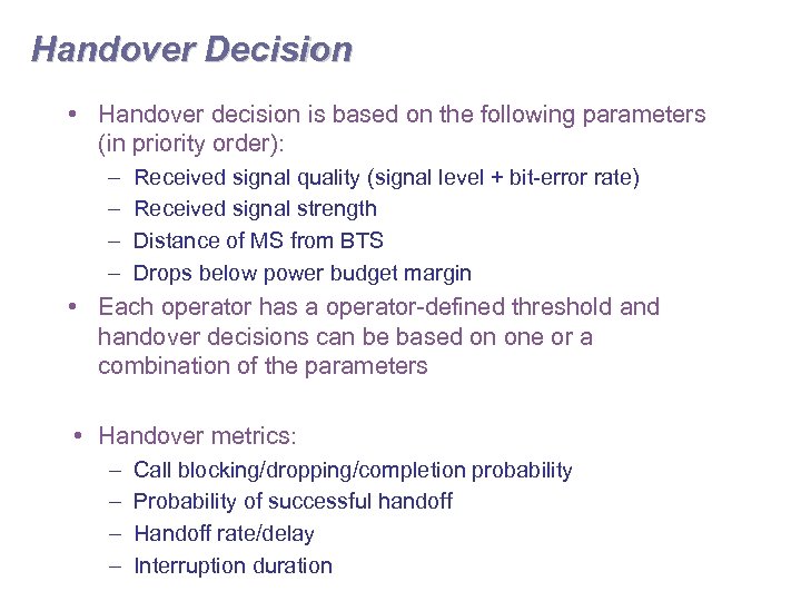 Handover Decision • Handover decision is based on the following parameters (in priority order): – – Received signal quality (signal level + bit-error rate) Received signal strength Distance of MS from BTS Drops below power budget margin • Each operator has a operator-defined threshold and handover decisions can be based on one or a combination of the parameters • Handover metrics: – – Call blocking/dropping/completion probability Probability of successful handoff Handoff rate/delay Interruption duration