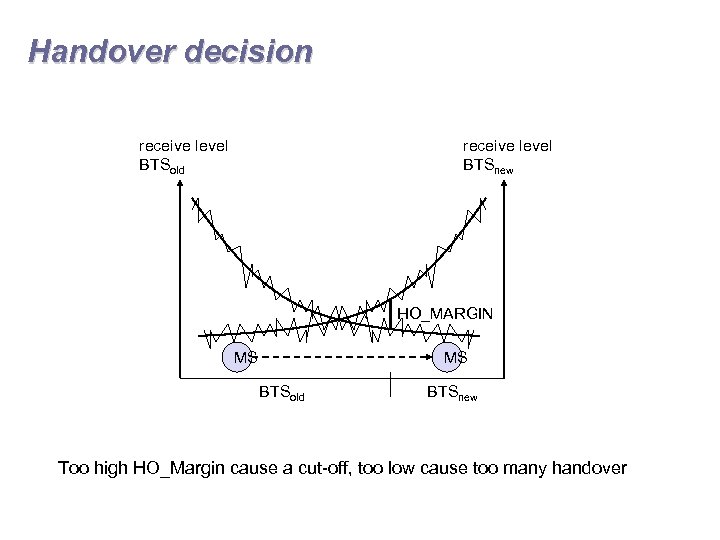 Handover decision receive level BTSold receive level BTSnew HO_MARGIN MS MS BTSold BTSnew Too high HO_Margin cause a cut-off, too low cause too many handover