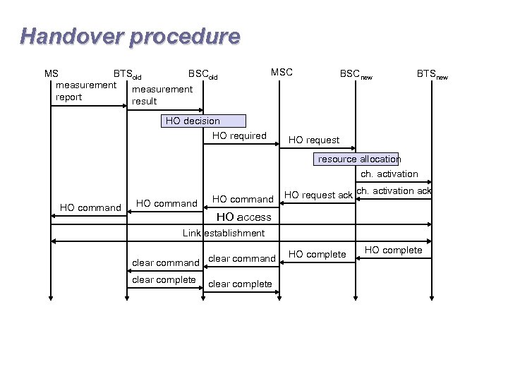Handover procedure MS BTSold BSCold measurement report result MSC BSCnew BTSnew HO decision HO required HO request resource allocation ch. activation HO command HO request ack ch. activation ack HO access Link establishment clear command clear complete HO complete