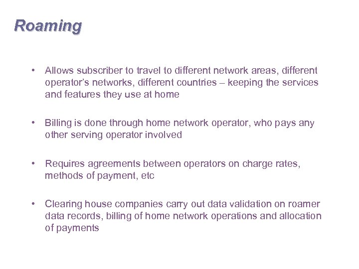 Roaming • Allows subscriber to travel to different network areas, different operator’s networks, different countries – keeping the services and features they use at home • Billing is done through home network operator, who pays any other serving operator involved • Requires agreements between operators on charge rates, methods of payment, etc • Clearing house companies carry out data validation on roamer data records, billing of home network operations and allocation of payments