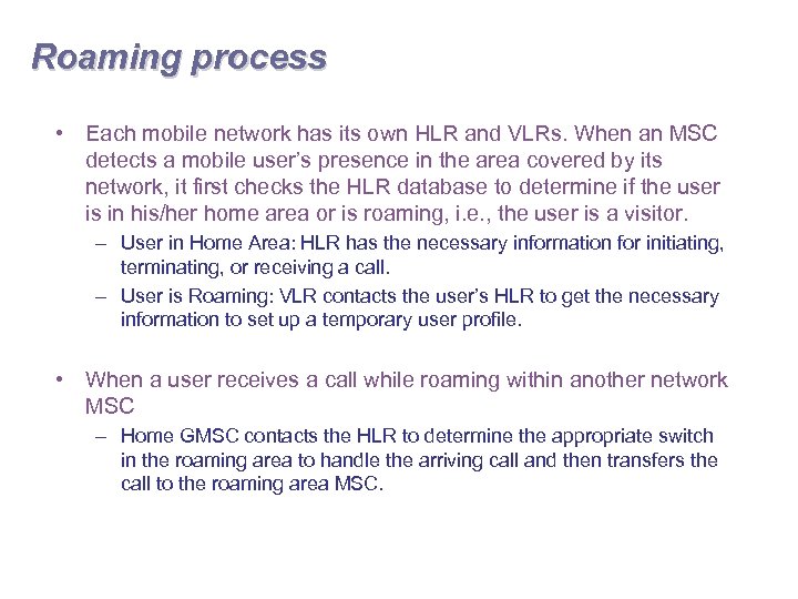 Roaming process • Each mobile network has its own HLR and VLRs. When an MSC detects a mobile user’s presence in the area covered by its network, it first checks the HLR database to determine if the user is in his/her home area or is roaming, i. e. , the user is a visitor. – User in Home Area: HLR has the necessary information for initiating, terminating, or receiving a call. – User is Roaming: VLR contacts the user’s HLR to get the necessary information to set up a temporary user profile. • When a user receives a call while roaming within another network MSC – Home GMSC contacts the HLR to determine the appropriate switch in the roaming area to handle the arriving call and then transfers the call to the roaming area MSC.
