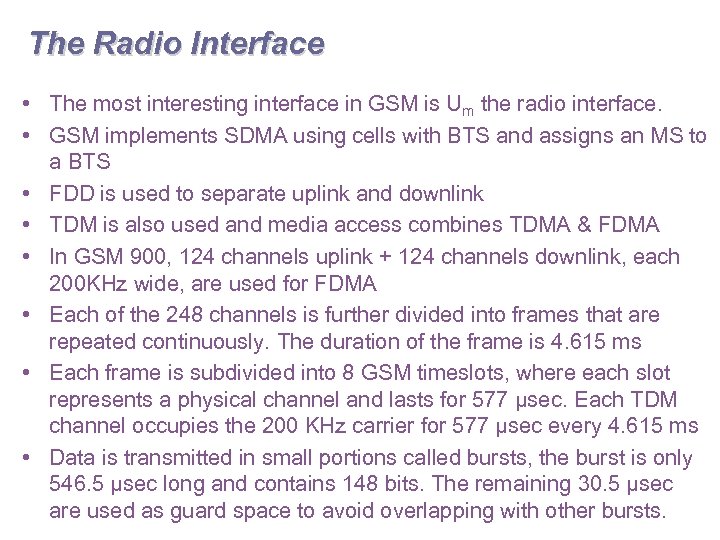 The Radio Interface • The most interesting interface in GSM is Um the radio interface. • GSM implements SDMA using cells with BTS and assigns an MS to a BTS • FDD is used to separate uplink and downlink • TDM is also used and media access combines TDMA & FDMA • In GSM 900, 124 channels uplink + 124 channels downlink, each 200 KHz wide, are used for FDMA • Each of the 248 channels is further divided into frames that are repeated continuously. The duration of the frame is 4. 615 ms • Each frame is subdivided into 8 GSM timeslots, where each slot represents a physical channel and lasts for 577 µsec. Each TDM channel occupies the 200 KHz carrier for 577 µsec every 4. 615 ms • Data is transmitted in small portions called bursts, the burst is only 546. 5 µsec long and contains 148 bits. The remaining 30. 5 µsec are used as guard space to avoid overlapping with other bursts.