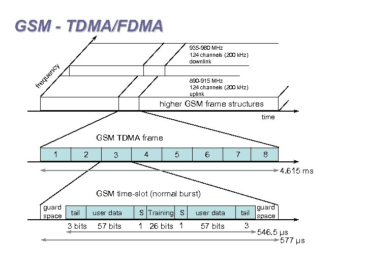 GSM - TDMA/FDMA qu en cy 935 -960 MHz 124 channels (200 k. Hz) downlink fre 890 -915 MHz 124 channels (200 k. Hz) uplink higher GSM frame structures time GSM TDMA frame 1 2 3 4 5 6 7 8 4. 615 ms GSM time-slot (normal burst) guard space tail 3 bits user data S Training S user data 57 bits 1 26 bits 1 57 bits guard tail space 3 546. 5 µs 577 µs