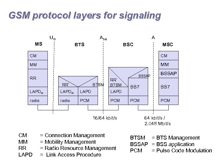 GSM protocol layers for signaling Um Abis MS A BTS BSC MSC CM CM MM MM = RR’ RR RR’ BTSM LAPDm LAPD radio PCM 16/64 kbit/s CM MM RR LAPD = Connection Management = Mobility Management = Radio Resource Management = Link Access Procedure BSSAP SS 7 PCM 64 kbit/s / 2. 048 Mbit/s BTSM = BTS Management BSSAP = BSS application PCM = Pulse Code Modulation