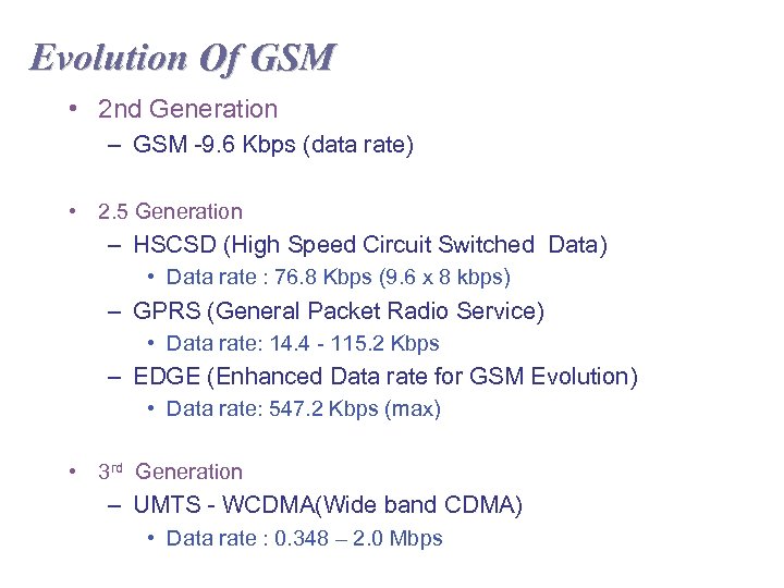 Evolution Of GSM • 2 nd Generation – GSM -9. 6 Kbps (data rate) • 2. 5 Generation – HSCSD (High Speed Circuit Switched Data) • Data rate : 76. 8 Kbps (9. 6 x 8 kbps) – GPRS (General Packet Radio Service) • Data rate: 14. 4 - 115. 2 Kbps – EDGE (Enhanced Data rate for GSM Evolution) • Data rate: 547. 2 Kbps (max) • 3 rd Generation – UMTS - WCDMA(Wide band CDMA) • Data rate : 0. 348 – 2. 0 Mbps