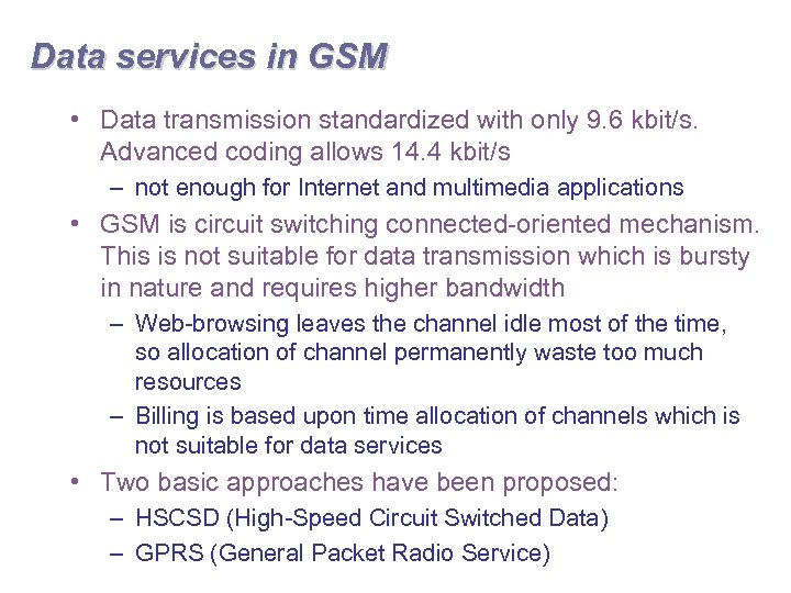 Data services in GSM • Data transmission standardized with only 9. 6 kbit/s. Advanced coding allows 14. 4 kbit/s – not enough for Internet and multimedia applications • GSM is circuit switching connected-oriented mechanism. This is not suitable for data transmission which is bursty in nature and requires higher bandwidth – Web-browsing leaves the channel idle most of the time, so allocation of channel permanently waste too much resources – Billing is based upon time allocation of channels which is not suitable for data services • Two basic approaches have been proposed: – HSCSD (High-Speed Circuit Switched Data) – GPRS (General Packet Radio Service)