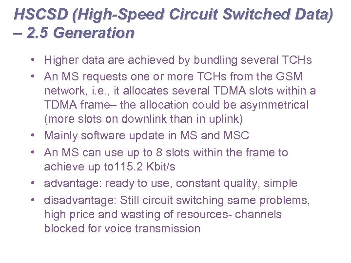 HSCSD (High-Speed Circuit Switched Data) – 2. 5 Generation • Higher data are achieved by bundling several TCHs • An MS requests one or more TCHs from the GSM network, i. e. , it allocates several TDMA slots within a TDMA frame– the allocation could be asymmetrical (more slots on downlink than in uplink) • Mainly software update in MS and MSC • An MS can use up to 8 slots within the frame to achieve up to 115. 2 Kbit/s • advantage: ready to use, constant quality, simple • disadvantage: Still circuit switching same problems, high price and wasting of resources- channels blocked for voice transmission