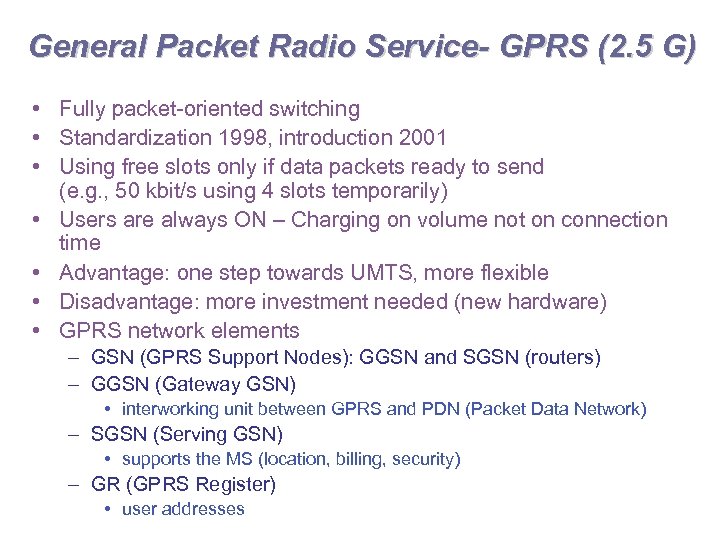 General Packet Radio Service- GPRS (2. 5 G) • Fully packet-oriented switching • Standardization 1998, introduction 2001 • Using free slots only if data packets ready to send (e. g. , 50 kbit/s using 4 slots temporarily) • Users are always ON – Charging on volume not on connection time • Advantage: one step towards UMTS, more flexible • Disadvantage: more investment needed (new hardware) • GPRS network elements – GSN (GPRS Support Nodes): GGSN and SGSN (routers) – GGSN (Gateway GSN) • interworking unit between GPRS and PDN (Packet Data Network) – SGSN (Serving GSN) • supports the MS (location, billing, security) – GR (GPRS Register) • user addresses