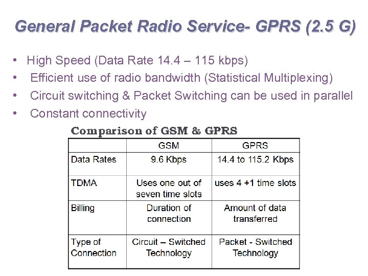 General Packet Radio Service- GPRS (2. 5 G) • High Speed (Data Rate 14. 4 – 115 kbps) • Efficient use of radio bandwidth (Statistical Multiplexing) • Circuit switching & Packet Switching can be used in parallel • Constant connectivity