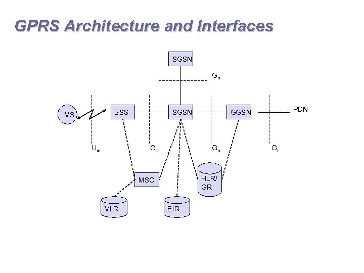 GPRS Architecture and Interfaces SGSN Gn BSS MS Um SGSN Gb Gn HLR/ GR MSC VLR EIR PDN GGSN Gi