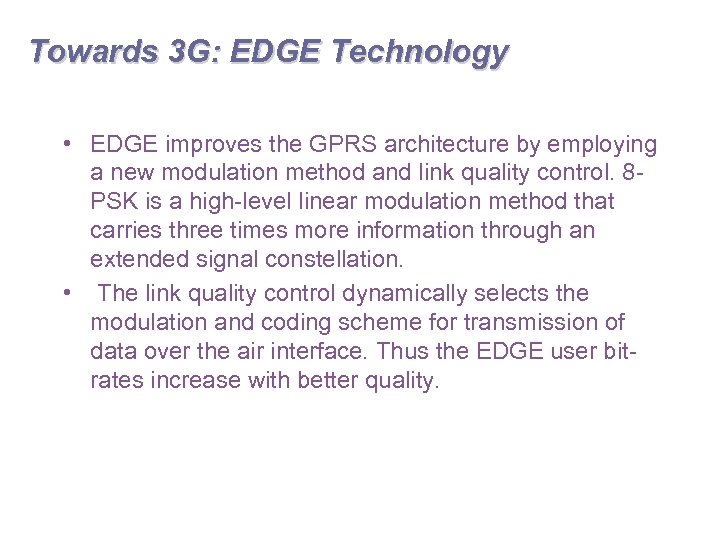 Towards 3 G: EDGE Technology • EDGE improves the GPRS architecture by employing a new modulation method and link quality control. 8 PSK is a high-level linear modulation method that carries three times more information through an extended signal constellation. • The link quality control dynamically selects the modulation and coding scheme for transmission of data over the air interface. Thus the EDGE user bitrates increase with better quality.