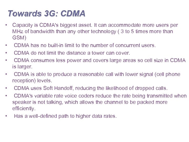 Towards 3 G: CDMA • Capacity is CDMA's biggest asset. It can accommodate more users per MHz of bandwidth than any other technology ( 3 to 5 times more than GSM) • CDMA has no built-in limit to the number of concurrent users. • CDMA do not limit the distance a tower can cover. • CDMA consumes less power and covers large areas so cell size in CDMA is larger. • CDMA is able to produce a reasonable call with lower signal (cell phone reception) levels. • CDMA uses Soft Handoff, reducing the likelihood of dropped calls. • CDMA's variable rate voice coders reduce the rate being transmitted when speaker is not talking, which allows the channel to be packed more efficiently. • Has a well-defined path to higher data rates.