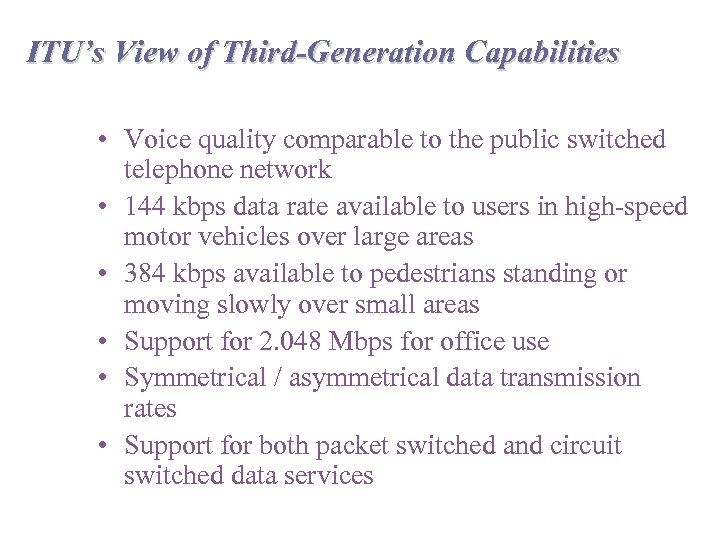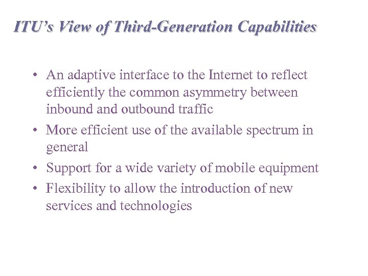 ITU’s View of Third-Generation Capabilities • An adaptive interface to the Internet to reflect efficiently the common asymmetry between inbound and outbound traffic • More efficient use of the available spectrum in general • Support for a wide variety of mobile equipment • Flexibility to allow the introduction of new services and technologies