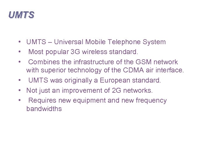 UMTS • UMTS – Universal Mobile Telephone System • Most popular 3 G wireless standard. • Combines the infrastructure of the GSM network with superior technology of the CDMA air interface. • UMTS was originally a European standard. • Not just an improvement of 2 G networks. • Requires new equipment and new frequency bandwidths