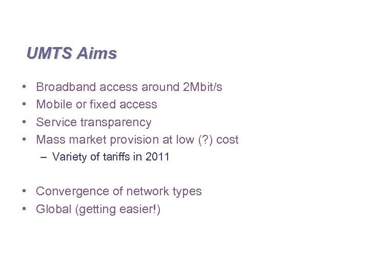 UMTS Aims • • Broadband access around 2 Mbit/s Mobile or fixed access Service transparency Mass market provision at low (? ) cost – Variety of tariffs in 2011 • Convergence of network types • Global (getting easier!)