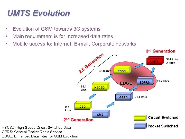 UMTS Evolution • Evolution of GSM towards 3 G systems • Main requirement is for increased data rates • Mobile access to: Internet, E-mail, Corporate networks HSCSD: High-Speed Circuit-Switched Data GPRS: General Packet Radio Service EDGE: Enhanced Data rates for GSM Evolution