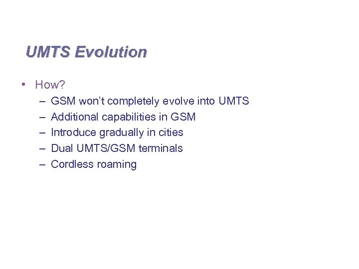 UMTS Evolution • How? – – – GSM won’t completely evolve into UMTS Additional capabilities in GSM Introduce gradually in cities Dual UMTS/GSM terminals Cordless roaming