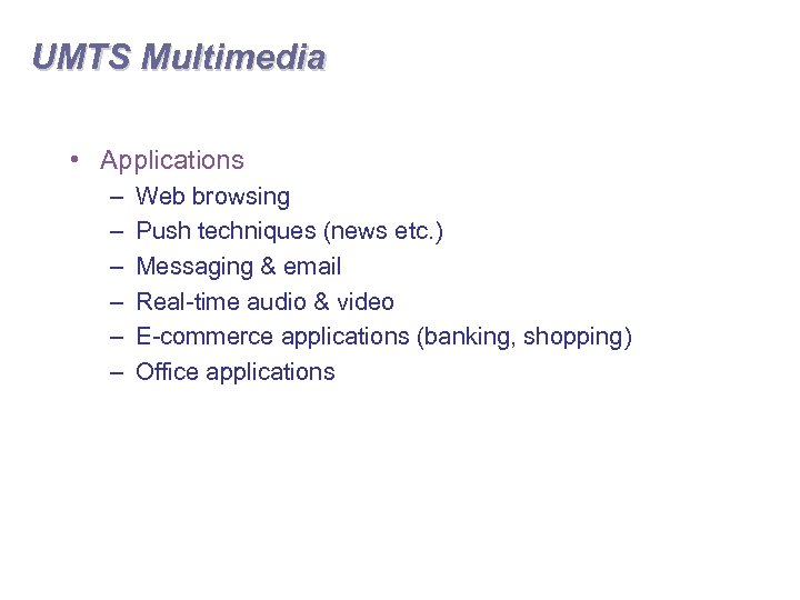 UMTS Multimedia • Applications – – – Web browsing Push techniques (news etc. ) Messaging & email Real-time audio & video E-commerce applications (banking, shopping) Office applications
