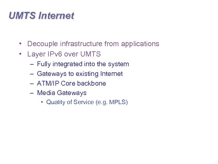 UMTS Internet • Decouple infrastructure from applications • Layer IPv 6 over UMTS – – Fully integrated into the system Gateways to existing Internet ATM/IP Core backbone Media Gateways • Quality of Service (e. g. MPLS)