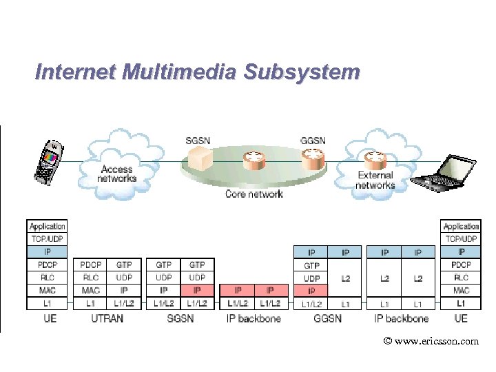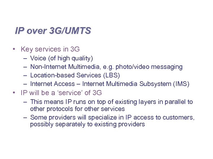 IP over 3 G/UMTS • Key services in 3 G – – Voice (of high quality) Non-Internet Multimedia, e. g. photo/video messaging Location-based Services (LBS) Internet Access – Internet Multimedia Subsystem (IMS) • IP will be a ‘service’ of 3 G – This means IP runs on top of existing layers in parallel to other protocols for other services – Some providers will specialize in IP access to customers, possibly separately to existing providers