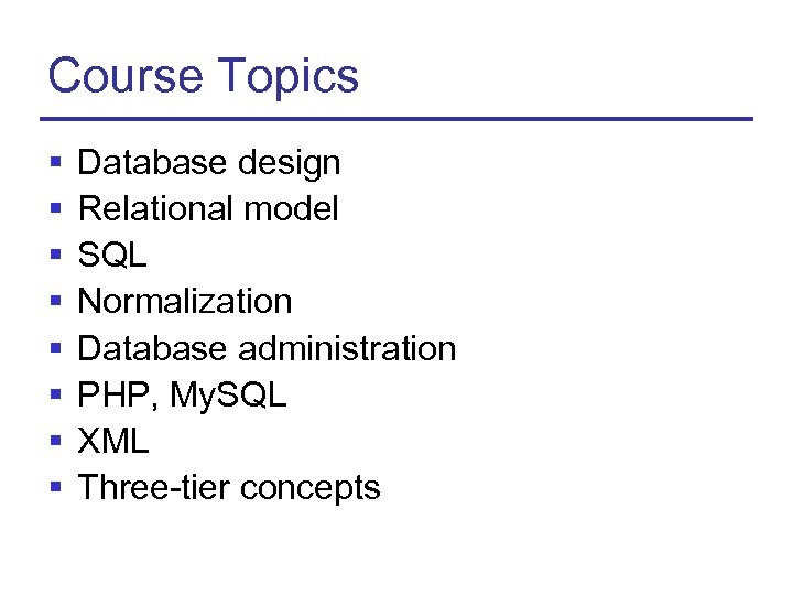 Course Topics § § § § Database design Relational model SQL Normalization Database administration PHP, My. SQL XML Three-tier concepts