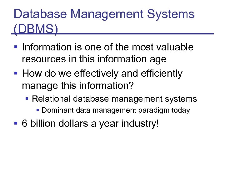Database Management Systems (DBMS) § Information is one of the most valuable resources in this information age § How do we effectively and efficiently manage this information? § Relational database management systems § Dominant data management paradigm today § 6 billion dollars a year industry!