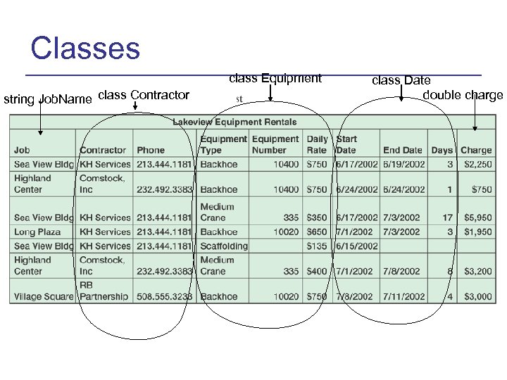 Classes class Equipment string Job. Name class Contractor class Date double charge