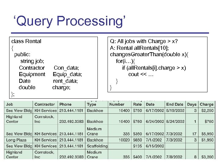 ‘Query Processing’ class Rental { public: string job; Contractor Equipment Date double }; Con_data; Equip_data; rent_data; charge; Q: All jobs with Charge > x? A: Rental all. Rentals[10]; changes. Greater. Than(double x){ for(i…){ if (all. Rentals[i]. charge > x) cout << … } }