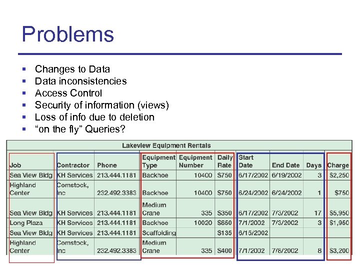 Problems § § § Changes to Data inconsistencies Access Control Security of information (views) Loss of info due to deletion “on the fly” Queries?