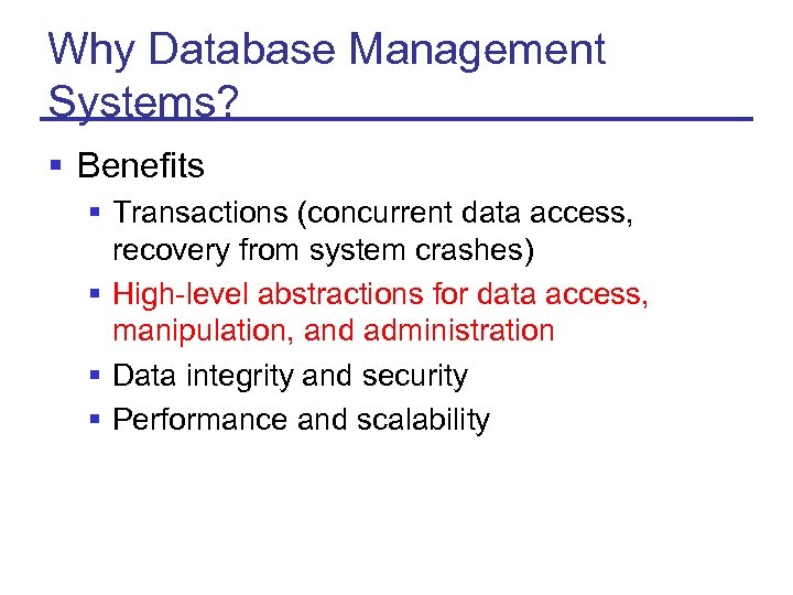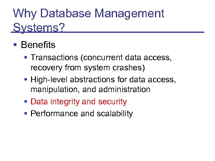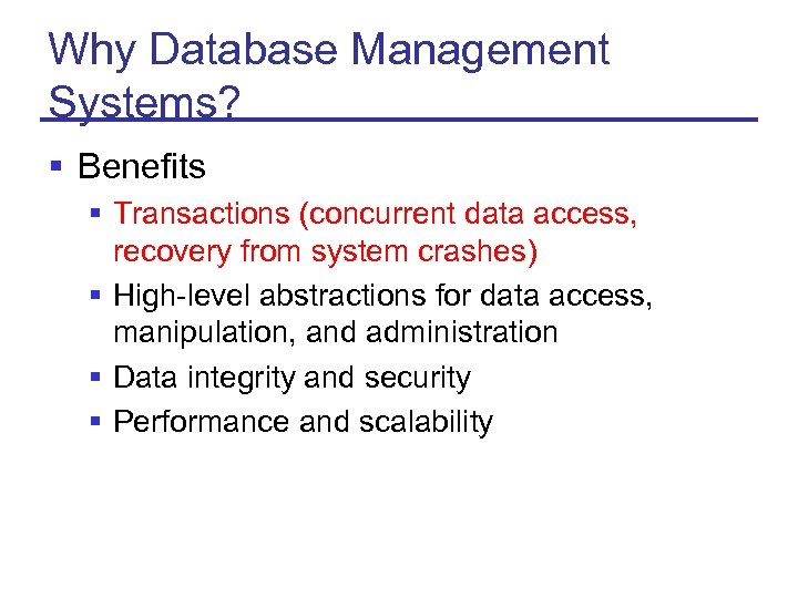 Why Database Management Systems? § Benefits § Transactions (concurrent data access, recovery from system crashes) § High-level abstractions for data access, manipulation, and administration § Data integrity and security § Performance and scalability