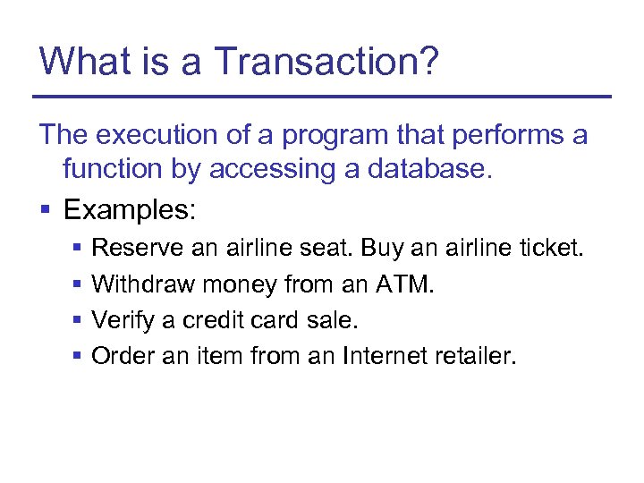 What is a Transaction? The execution of a program that performs a function by accessing a database. § Examples: § § Reserve an airline seat. Buy an airline ticket. Withdraw money from an ATM. Verify a credit card sale. Order an item from an Internet retailer.
