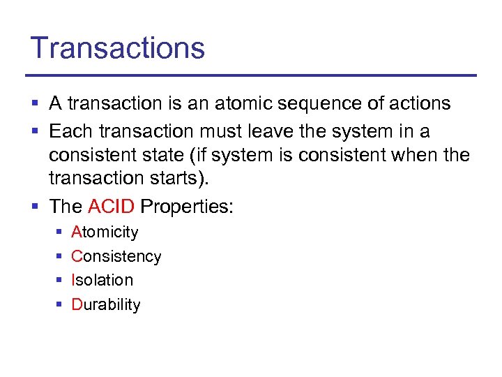 Transactions § A transaction is an atomic sequence of actions § Each transaction must leave the system in a consistent state (if system is consistent when the transaction starts). § The ACID Properties: § § Atomicity Consistency Isolation Durability