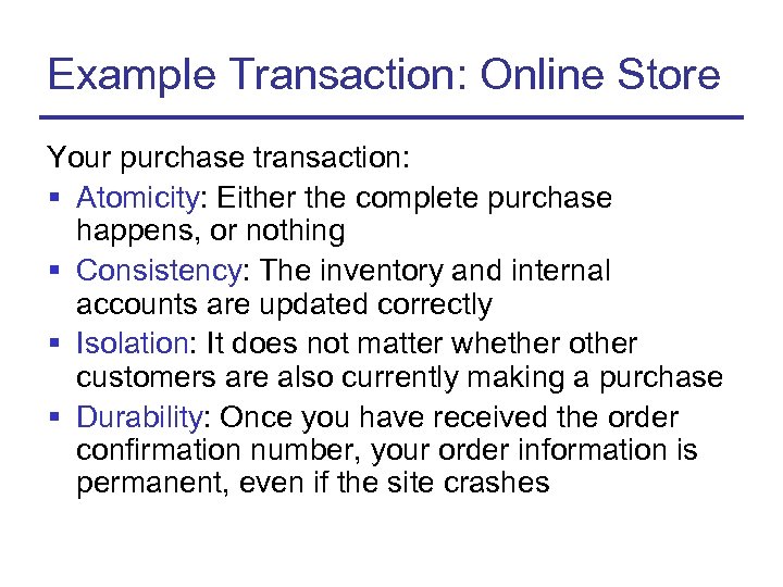 Example Transaction: Online Store Your purchase transaction: § Atomicity: Either the complete purchase happens, or nothing § Consistency: The inventory and internal accounts are updated correctly § Isolation: It does not matter whether other customers are also currently making a purchase § Durability: Once you have received the order confirmation number, your order information is permanent, even if the site crashes