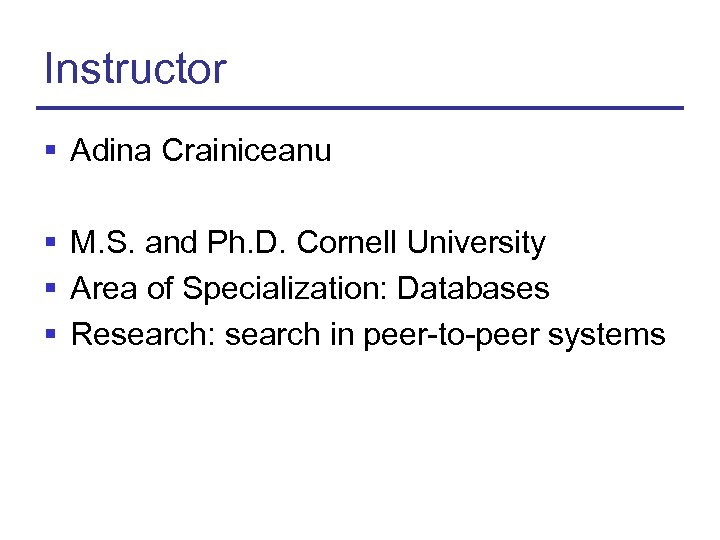 Instructor § Adina Crainiceanu § M. S. and Ph. D. Cornell University § Area of Specialization: Databases § Research: search in peer-to-peer systems