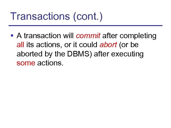 Transactions (cont. ) § A transaction will commit after completing all its actions, or it could abort (or be aborted by the DBMS) after executing some actions.