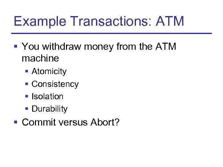 Example Transactions: ATM § You withdraw money from the ATM machine § § Atomicity Consistency Isolation Durability § Commit versus Abort?