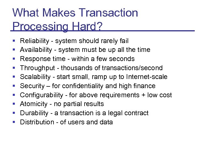 What Makes Transaction Processing Hard? § § § § § Reliability - system should rarely fail Availability - system must be up all the time Response time - within a few seconds Throughput - thousands of transactions/second Scalability - start small, ramp up to Internet-scale Security – for confidentiality and high finance Configurability - for above requirements + low cost Atomicity - no partial results Durability - a transaction is a legal contract Distribution - of users and data