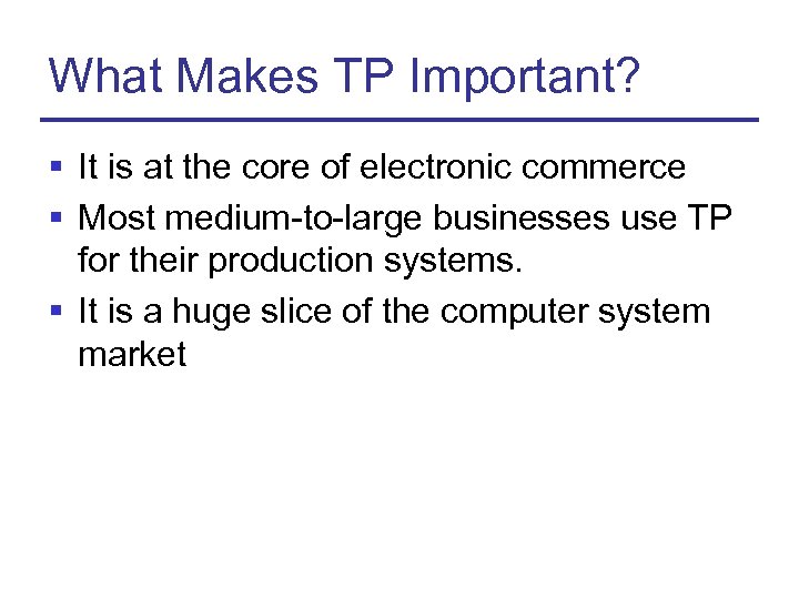 What Makes TP Important? § It is at the core of electronic commerce § Most medium-to-large businesses use TP for their production systems. § It is a huge slice of the computer system market