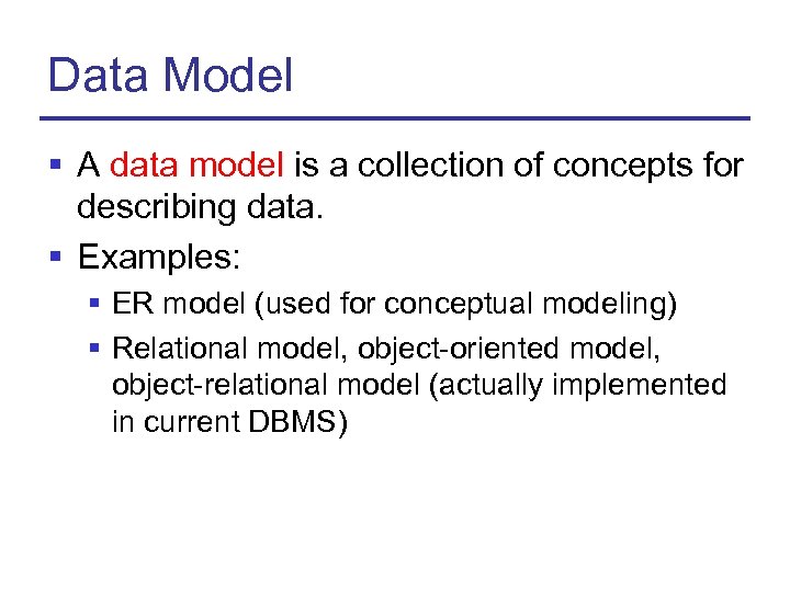 Data Model § A data model is a collection of concepts for describing data. § Examples: § ER model (used for conceptual modeling) § Relational model, object-oriented model, object-relational model (actually implemented in current DBMS)