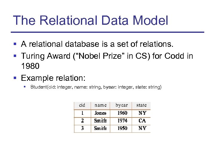 The Relational Data Model § A relational database is a set of relations. § Turing Award (“Nobel Prize” in CS) for Codd in 1980 § Example relation: § Student(cid: integer, name: string, byear: integer, state: string)