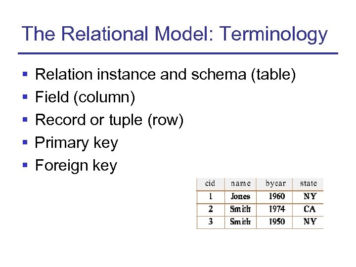 The Relational Model: Terminology § § § Relation instance and schema (table) Field (column) Record or tuple (row) Primary key Foreign key