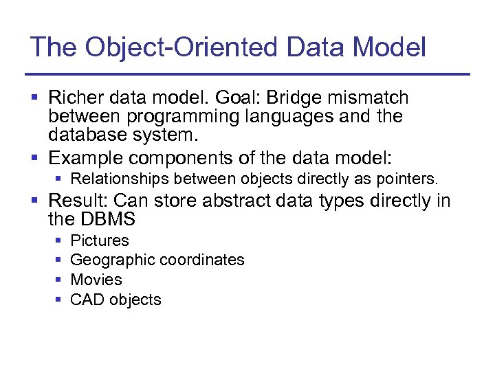 The Object-Oriented Data Model § Richer data model. Goal: Bridge mismatch between programming languages and the database system. § Example components of the data model: § Relationships between objects directly as pointers. § Result: Can store abstract data types directly in the DBMS § § Pictures Geographic coordinates Movies CAD objects