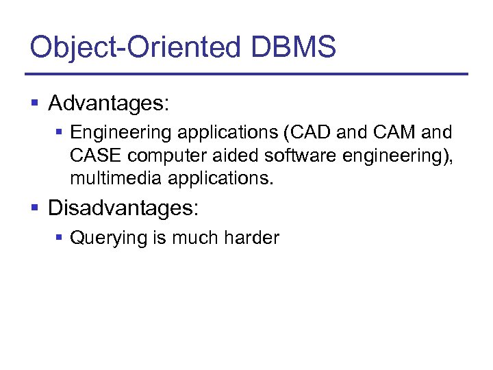 Object-Oriented DBMS § Advantages: § Engineering applications (CAD and CAM and CASE computer aided software engineering), multimedia applications. § Disadvantages: § Querying is much harder