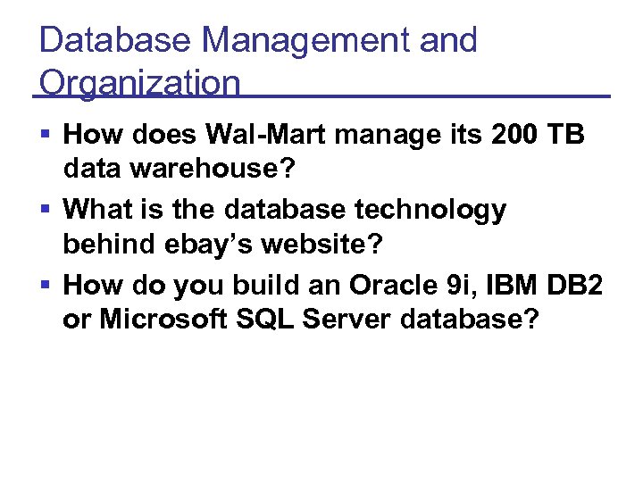 Database Management and Organization § How does Wal-Mart manage its 200 TB data warehouse? § What is the database technology behind ebay’s website? § How do you build an Oracle 9 i, IBM DB 2 or Microsoft SQL Server database?
