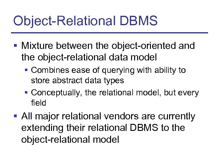 Object-Relational DBMS § Mixture between the object-oriented and the object-relational data model § Combines ease of querying with ability to store abstract data types § Conceptually, the relational model, but every field § All major relational vendors are currently extending their relational DBMS to the object-relational model