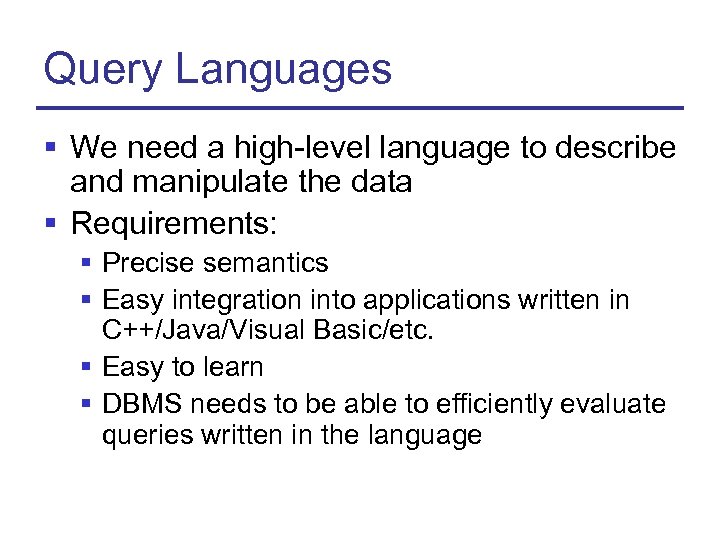 Query Languages § We need a high-level language to describe and manipulate the data § Requirements: § Precise semantics § Easy integration into applications written in C++/Java/Visual Basic/etc. § Easy to learn § DBMS needs to be able to efficiently evaluate queries written in the language