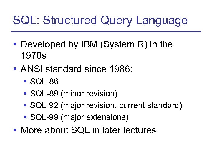 SQL: Structured Query Language § Developed by IBM (System R) in the 1970 s § ANSI standard since 1986: § § SQL-86 SQL-89 (minor revision) SQL-92 (major revision, current standard) SQL-99 (major extensions) § More about SQL in later lectures